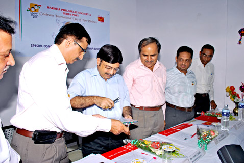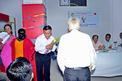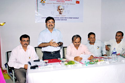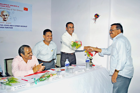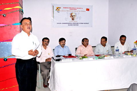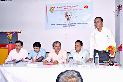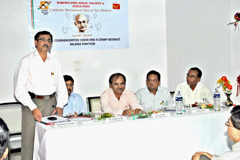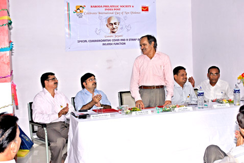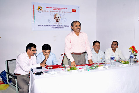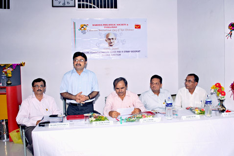 Shri Alok Pande, Director, Postal Services, Vadodara Region, Shri A. K. A. Joshi, Postmaster General, Vadodara Region, Shri Timir Shah, Hon. Secy., BPS and Shri N. D. Prajapati, S.S.P. Vadodara (East) Division giving welcome Speech. |
